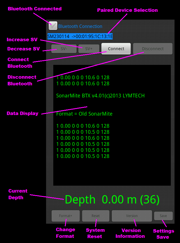 The App is dedicated to connecting to the SonarMite and providing most simple commands via pre-programmed buttons. Dedicated buttons give a more intuitive interface than using the dropdown keyboard or voice interface. Buttons include ‘Format’ to change the data output format, ‘Version’ will show the current firmware version and ‘Reset’ will cancel any changes and set the instrument back to its default settings.