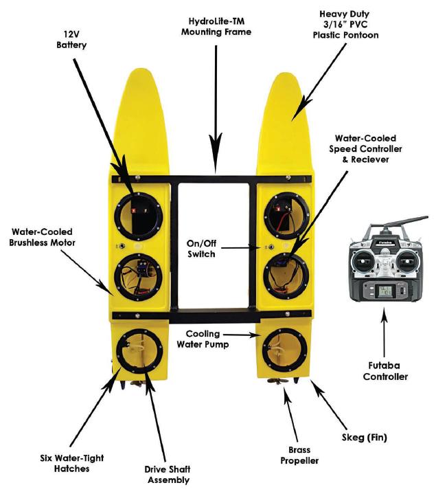 HyDrone is rugged, lightweight, and manufactured from high quality marine components. The system is easily disassembled for transport and shipping. Work environments include mines, sewage treatment plants, contaminated lakes, harbors, and rivers.