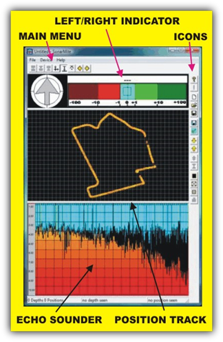 The SonarMite software presents the user with a three window interface separated by ‘Splitter Window Bars’ which can be dragged to increase or decrease the active window size. If the window is sized to less than a proportion of its width then the window will suppress graphic output and present a scaled text message.